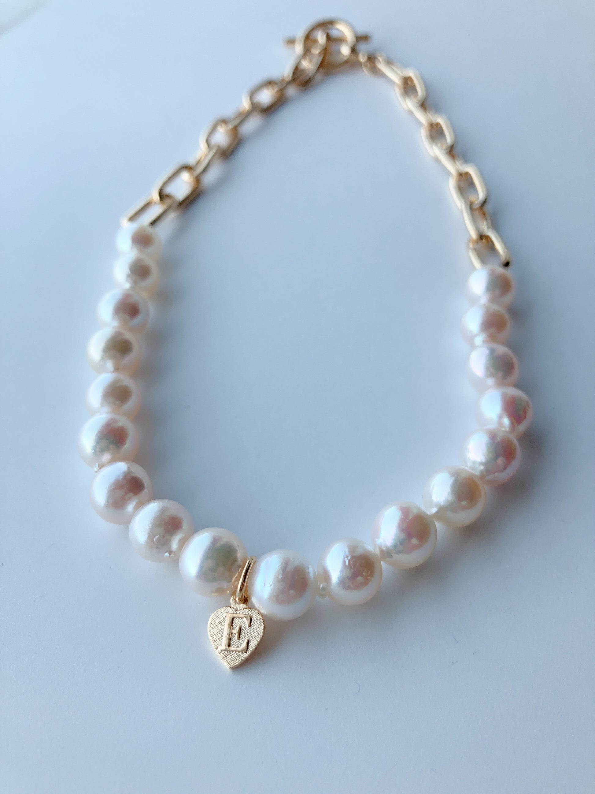 付け方も変幻自在で、チャームをセンターにすればリッチなパールネックレスとして、チェーンとハーフで付ければ甘辛ミックスな表情に。二重に重ねてボリュームたっぷりのゴージャスブレスとしても。